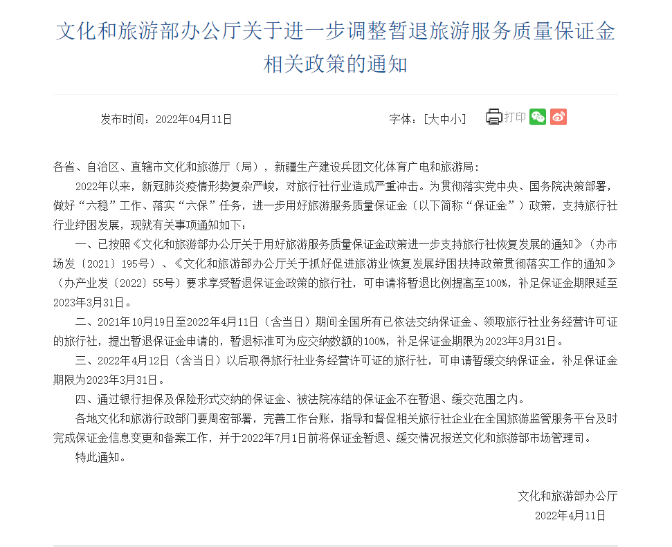 根据文化和旅游部办公厅11日印发的通知,为支持旅行社行业纾困发展,符合相关条件的旅行社可申请全额暂退保证金或暂缓交纳,补足保证金期限延至2023年3月31日。通过银行担保及保险形式交纳的保证金、被法院冻结的保证金不在暂退、缓交范围之内。(记者徐壮)