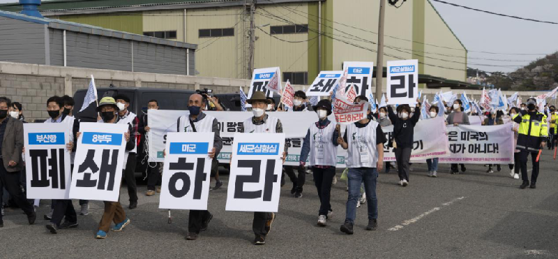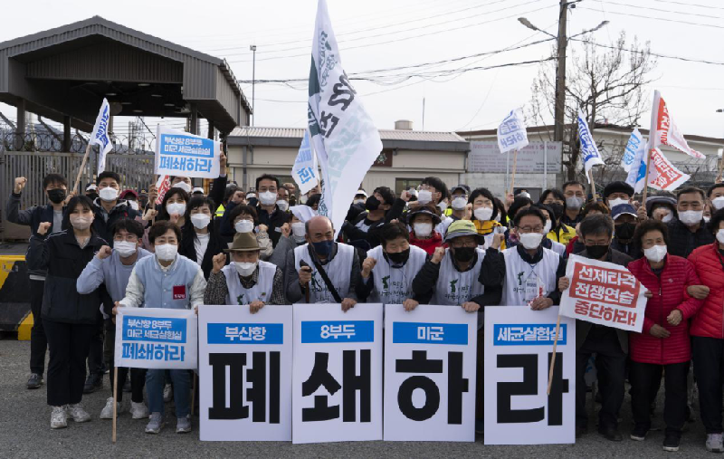 2022年4月5日,韩国民间团体在位于韩国釜山的美军基地附近游行示威,呼吁停止韩美联合军事演习,要求关闭釜山港美军基地内的生物实验设施。李相浩摄