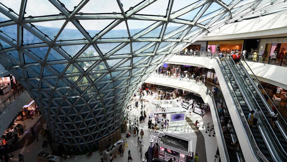 ↑游客在三亚国际免税城购物(2020年8月6日摄)。