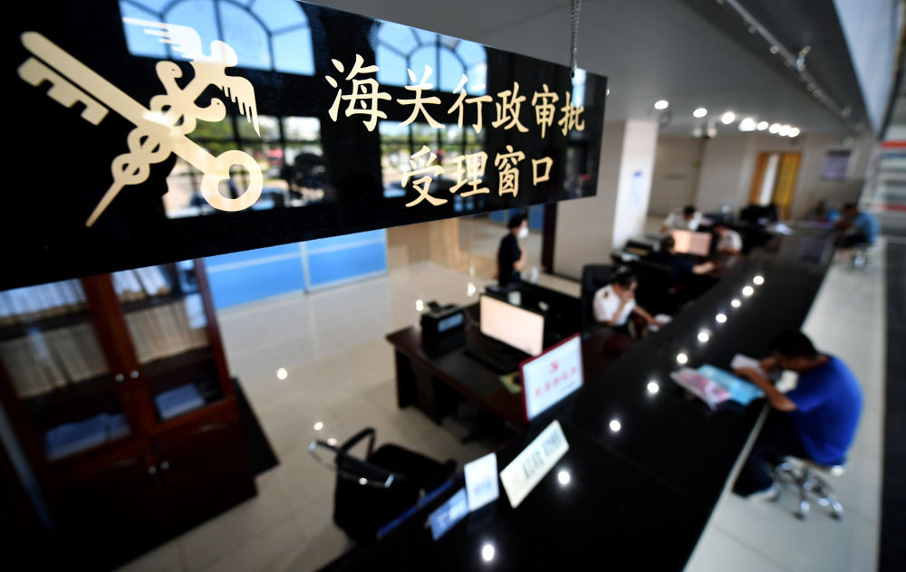 ↑2021年5月26日,工作人员在海口综合保税区政务服务中心办理报关业务。