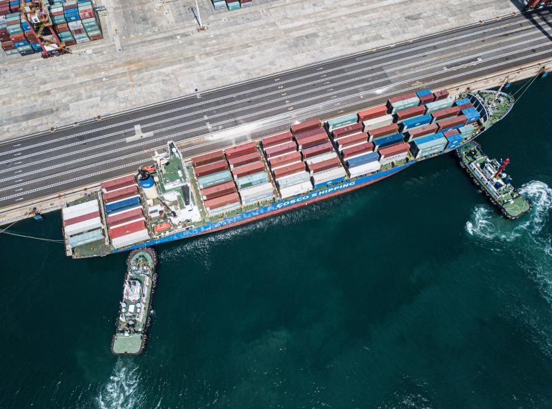 2020年9月23日,引航员指挥两艘拖轮辅助一艘集装箱船靠泊在洋浦港小铲滩码头(无人机照片)。 新华社记者 蒲晓旭 摄