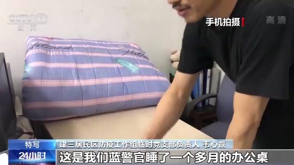 建三居民区防疫工作组临时党支部负责人 韦心磊:这是我们蓝警官睡了一个多月的办公桌,中间还不是很平整。有时候我们送点物资到居民家中,居民会给我们深深鞠一躬,那时候感动还是非常非常大的。