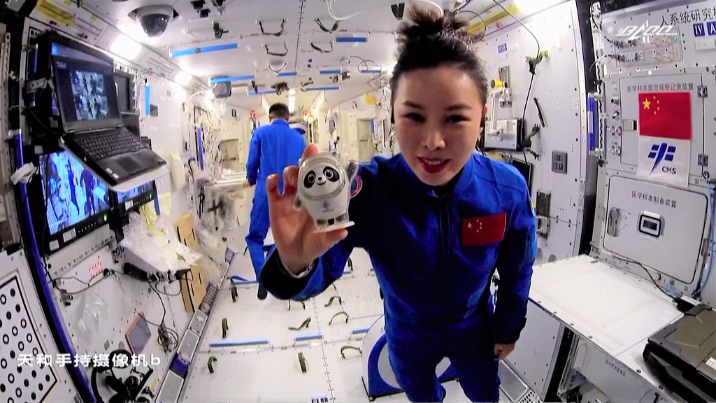 △“天宫课堂”中,王亚平和“冰墩墩”在中国空间站同框。