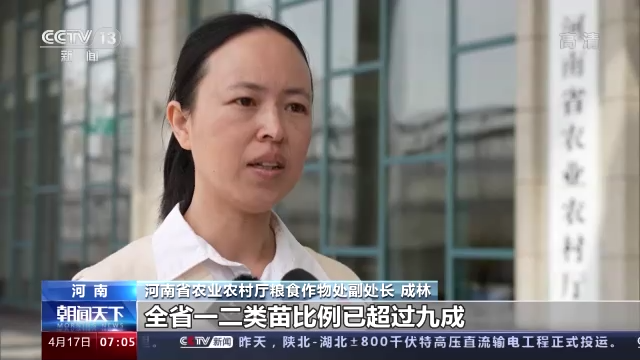 河南省农业农村厅粮食作物处副处长 成林:今年我省小麦最大特点是面积稳。全省麦播面积持续稳定在8500万亩以上,根据我们最新的苗情调度,全省一二类苗比例已超过九成。