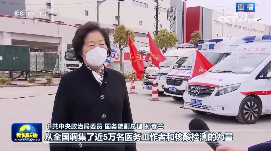 中共中央政治局委员 国务院副总理 孙春兰:我们按照总书记的要求,从全国调集了近5万名医务工作者和核酸检测的力量。在上海市委的领导下共同抗疫,已经取得了阶段性的成果,疫情的传播指数由当初的2.27下降到现在的1.23。我们早日实现社会面清零的目标指日可待。奥密克戎传播速度快,被感染以后,脆弱群体还是风险很大的,所以我们还是要加快防控的速度,早日打赢这场歼灭战。