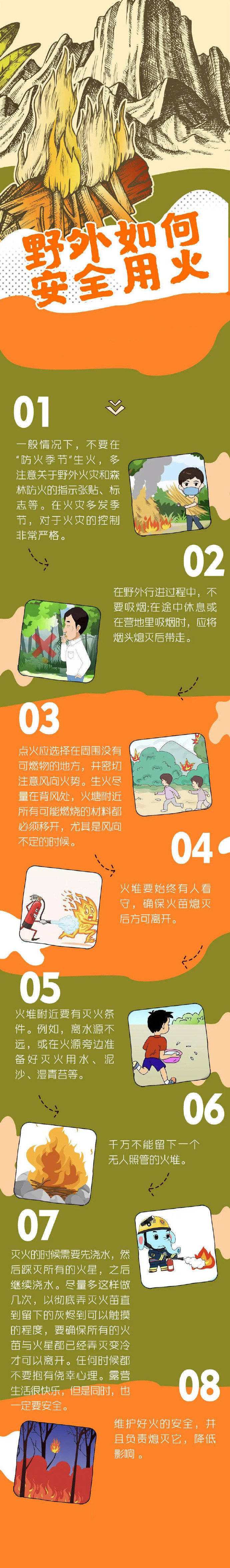 【野外用火有哪些注意事项?】一般情况下,不要在“防火季节”生火,多注意关于野外火灾和森林防火的指示张贴、标志等。在火灾多发季节,严格控制火种的使用。