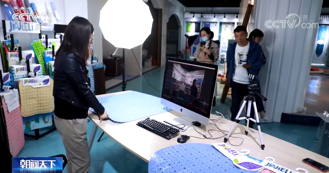 在这家高新技术企业的直播间,主播正向客户展示一款专门为广交会开发的新款浴室垫,这款新产品采用新材料,吸盘吸力更大,防滑性能更高。