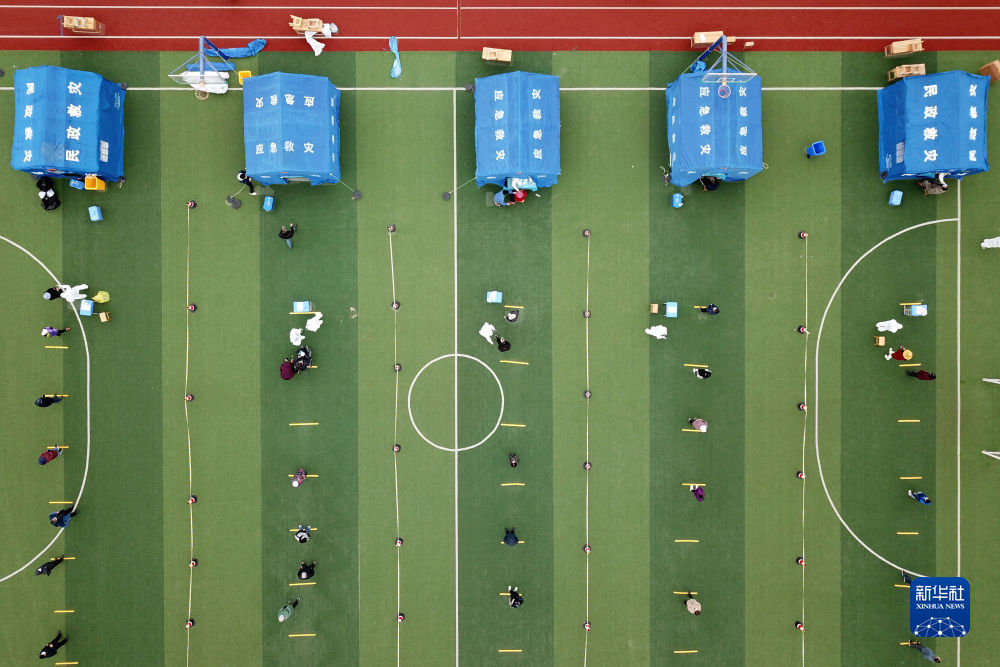 4月15日,在西宁市城西区行知小学采样点,市民排队参加核酸采样(无人机照片)。新华社记者 范培珅 摄