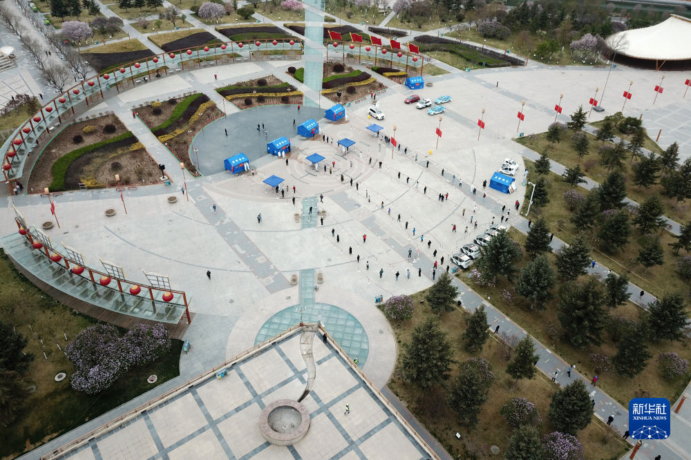 4月15日,在西宁市城北区生物园区广场采样点,市民排队参加核酸采样(无人机照片)。新华社记者 范培珅 摄
