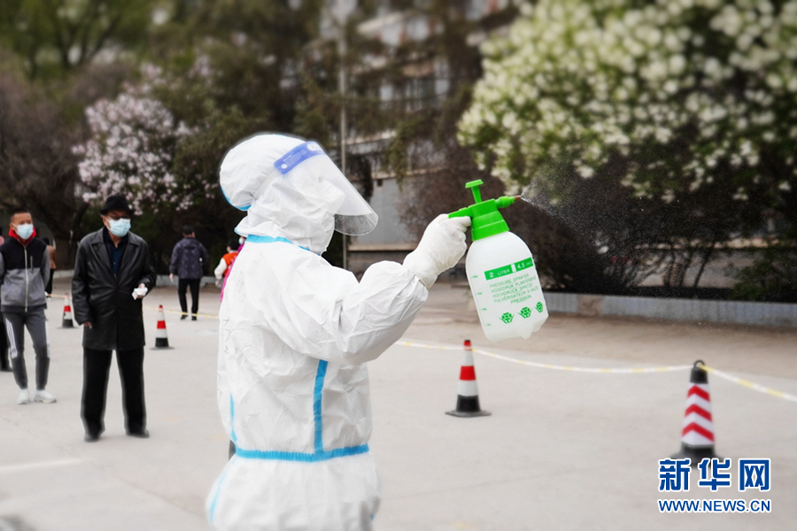 4月15日,工作人员在西宁市城中区原前营街小学采样点进行现场消杀。新华网发(谢青玉 摄)