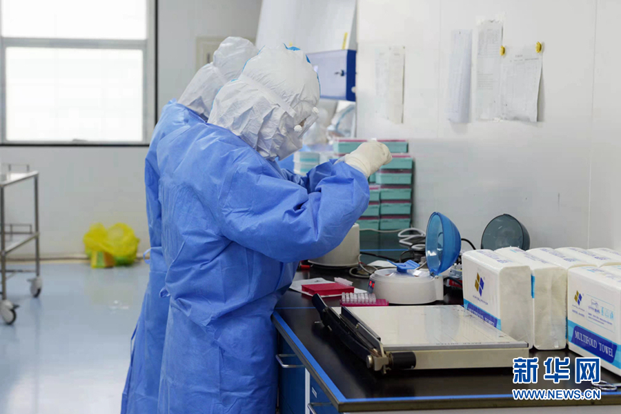4月15日,在青海省人民医院检验科,工作人员正在对采集样本做核酸检测。新华网发(肖舒泽 摄)