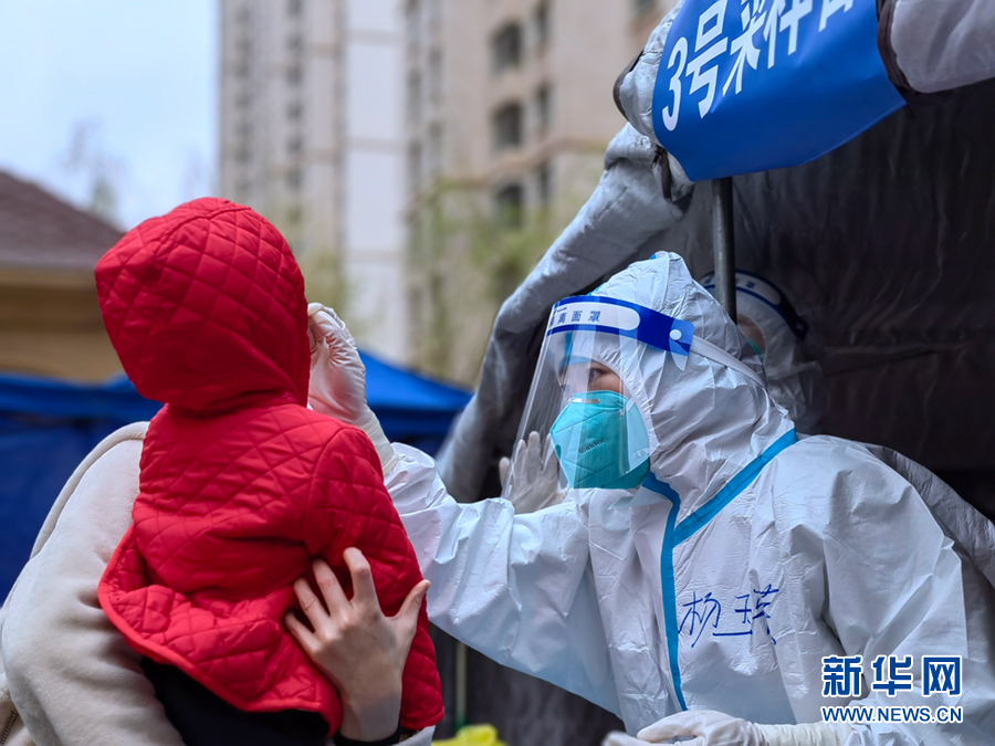4月15日,西宁市城北区一采样点,工作人员正在为一位小朋友做核酸采样。新华网发(肖舒泽摄)