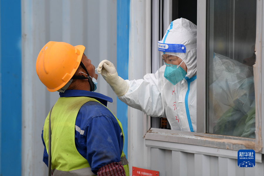 4月16日,在西宁经济技术开发区南川工业园区一企业建设工地,医务人员进行核酸采样。新华社记者 范培珅 摄