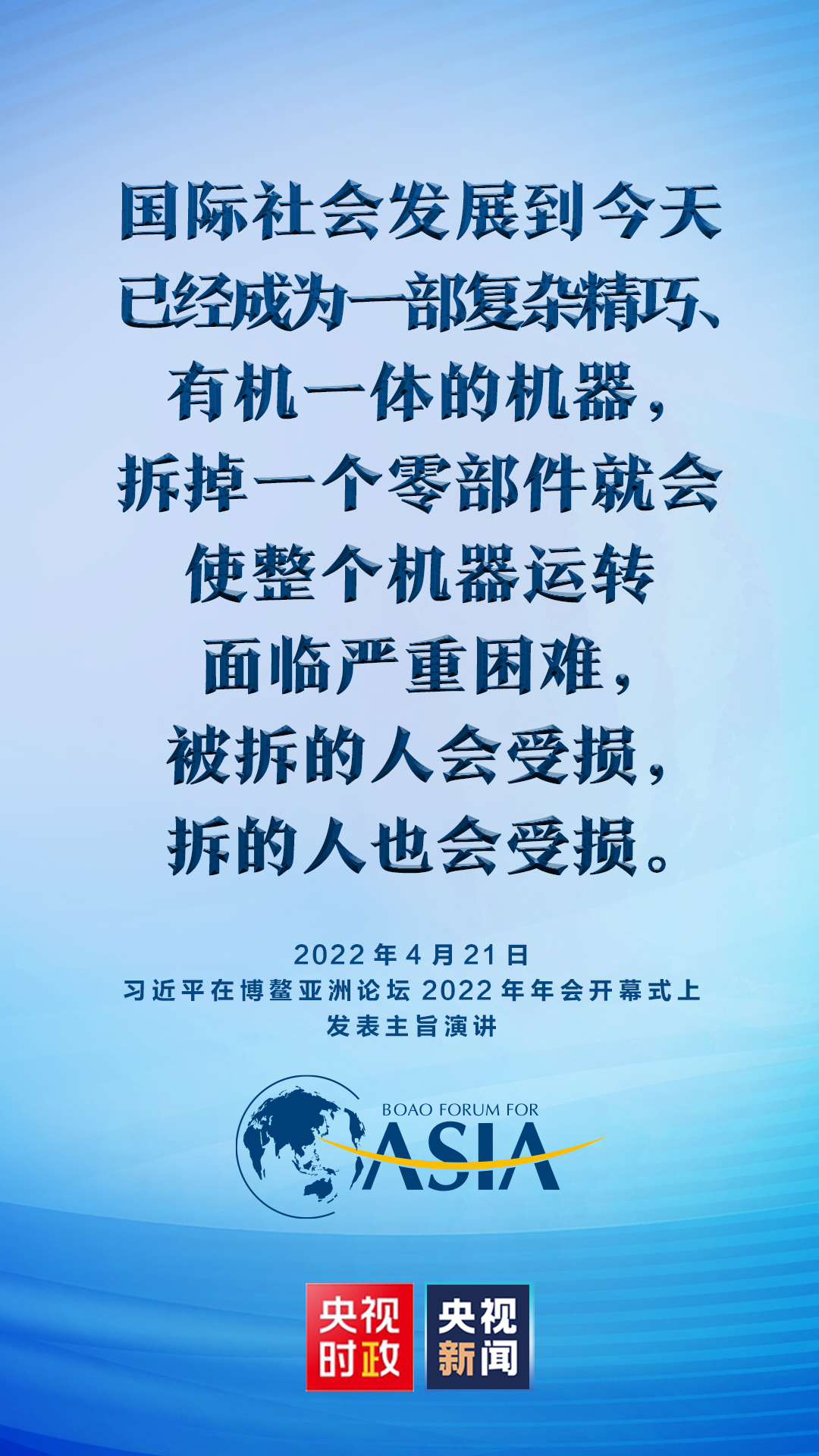 习近平说:“世界各国乘坐在一条命运与共的大船上,要穿越惊涛骇浪、驶向光明未来,必须同舟共济,企图把谁扔下大海都是不可接受的。国际社会发展到今天已经成为一部复杂精巧、有机一体的机器,拆掉一个零部件就会使整个机器运转面临严重困难,被拆的人会受损,拆的人也会受损。”