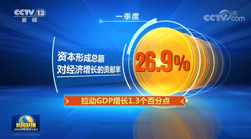 瞄准重大工程、重点领域,一季度,全国固定资产投资规模不断扩大,投资拉动经济的增长作用提升。一季度,资本形成总额对经济增长的贡献率为26.9%,拉动GDP增长1.3个百分点。