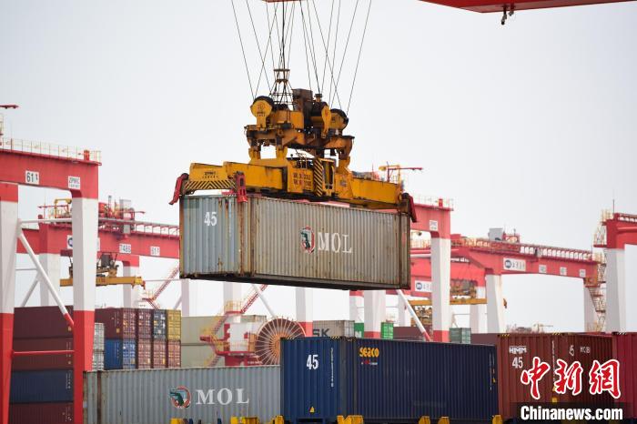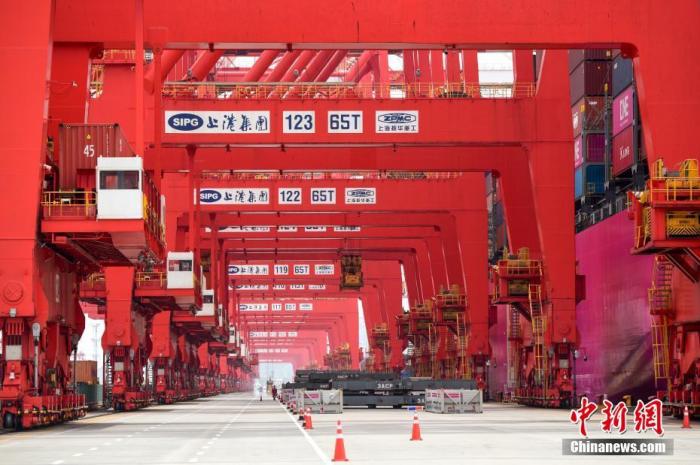 4月27日,上海洋山深水港,岸桥起重机正在装卸货物。中新社记者 田雨昊 摄