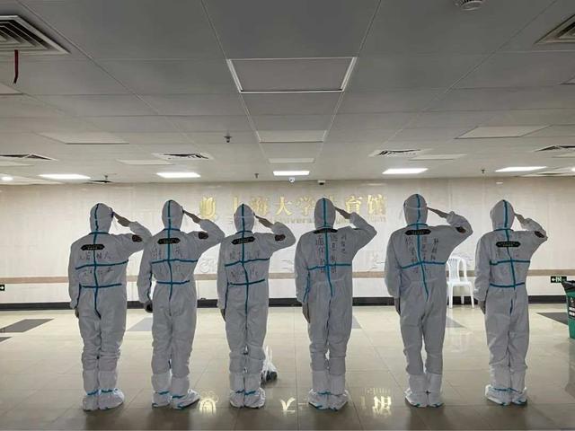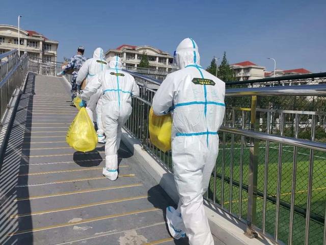 4月中旬,上海气温反复,有时大雨倾盆,有几天最高温度近30摄氏度。回忆起那次高温天的任务,赵永吉记忆犹新:“为了及时将餐饭送到学生们手中,队员们一个台阶接一个台阶、一层又一层,上楼、下楼……循环往复地爬楼梯,终于完成了发放。结束送餐的时候,脱掉防护服的我们就像是洗了一个热水澡一样。”