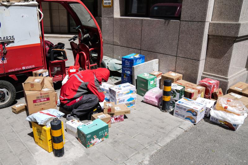 4月26日,在北京市朝阳区广和里西路一小区(防控区内)门口,快递员在整理货品准备投递。新华社记者彭子洋摄