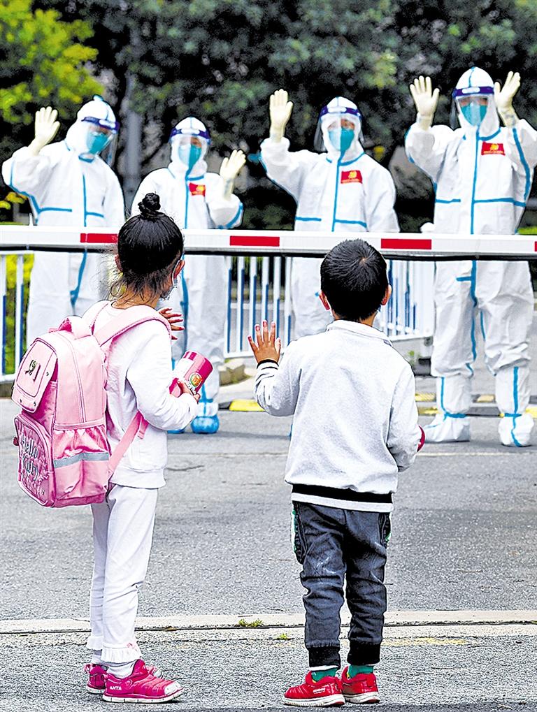 4月30日,走出医院准备回家时,小华(右)和姐姐回身向医护人员挥手道别。小华(化名)是目前上海新冠定点医院出院的最小重症新冠患者。新华社记者 李 贺摄