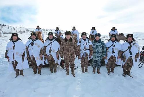 △2014年1月26日,习近平主席在内蒙古阿尔山与边防线上巡逻执勤的官兵合影。