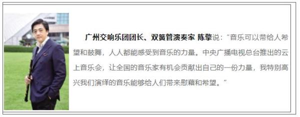 “交响乐之父”海顿为世人留下名言,“艺术的真正意义在于使人幸福,使人得到鼓舞和力量。”参加“五一”云上音乐会演奏的艺术家们表示,加入总台《音乐传递温暖,坚持就是胜利——“五一”云上音乐会》的演奏,不光是个人和乐团的责任,更是一种荣耀——彰显音乐之力的荣耀感。