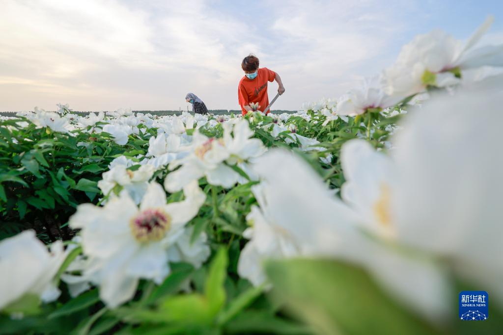 5月5日,农民在河北省唐山市丰南区唐坊镇赵翎庄村的油用牡丹田劳作。
