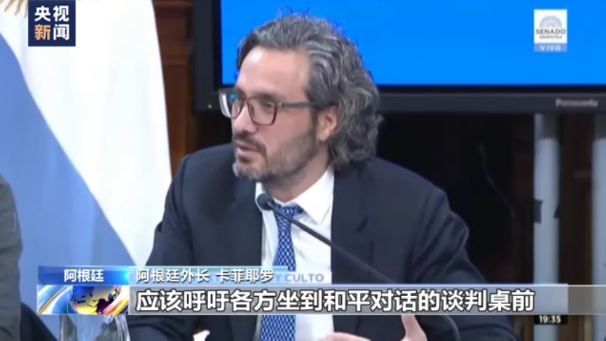 阿根廷外长 卡菲耶罗:我们认为,应该呼吁各方坐到和平对话的谈判桌前,通过国际协商机制,相关国际条约以及外交手段等解决俄乌冲突。到目前为止,联合国安理会尚未通过任何有关制裁俄罗斯的决议,因此,阿根廷政府也不会对俄罗斯采取任何制裁措施。阿根廷不支持将俄罗斯驱逐出二十国集团的制裁措施,因为我们认为这是个多边主义问题需要全球各国共同协商。