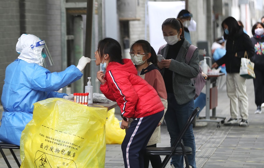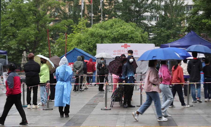 5月8日,北京市东城区景山东街核酸检测点,居民排队进行核酸采样。中国日报记者 邹红 摄
