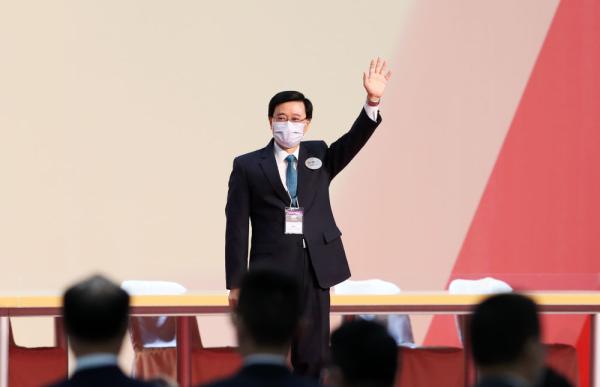 5月8日,在香港会议展览中心,李家超挥手致意。(新华社记者李钢摄)