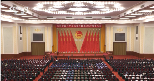 今天,我们在这里隆重集会,庆祝中国共产主义青年团成立100周年,就是要激励广大团员青年在实现中华民族伟大复兴中国梦的新征程上奋勇前进。