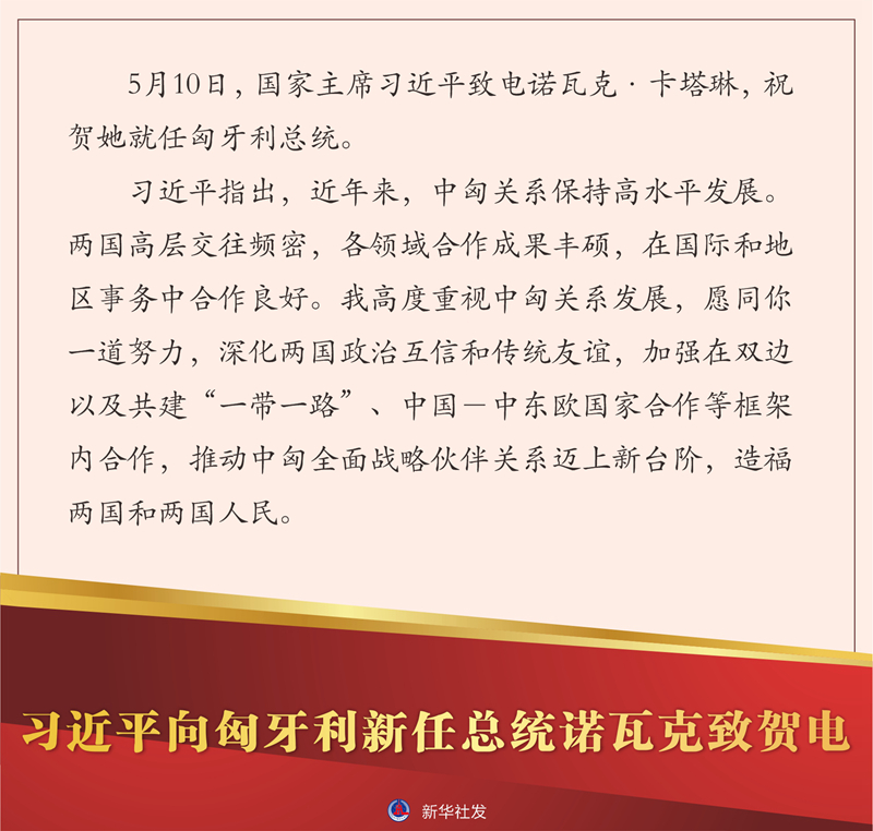 5月10日,国家主席习近平致电诺瓦克·卡塔琳,祝贺她就任匈牙利总统。