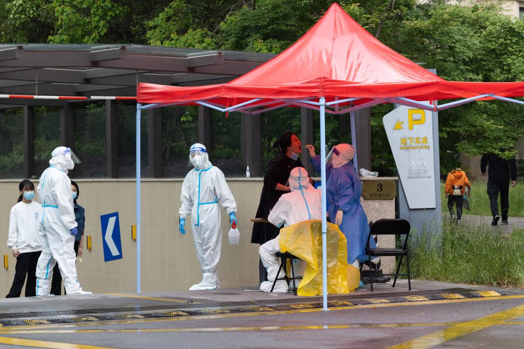 5月11日,上海市浦东新区北蔡镇乾景雅园小区,居民做核酸采样。(新华社记者金立旺 摄)