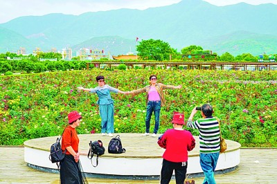 游客在温州市苍南县马站镇中魁村花海里赏花、拍照。