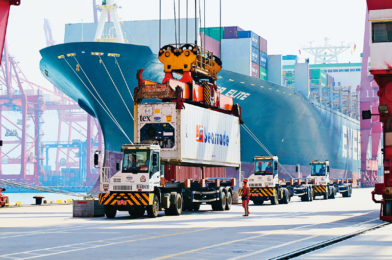 社会主义是干出来的,新时代是奋斗出来的。“五一”假期,许多劳动者坚守岗位,在辛勤工作中度过劳动者的节日。图为2022年5月3日,在江苏省连云港港集装箱码头,工作人员为到港货船卸运集装箱。 新华社发 王健民/摄