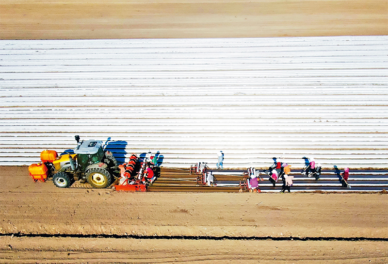 耕地是粮食生产的命根子。近年来,各地持续推进农田水利设施和高标准农田建设,加快良种、先进农机装备攻关和推广应用,不断提高农业综合生产能力,促进农民致富增收。图为2022年4月29日,工作人员在国家现代农业示范区——河北省张家口市塞北管理区农业基地播种胡萝卜。 新华社发 武殿森/摄
