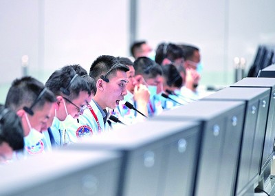 2021年6月17日,在北京航天飞行控制中心,科研人员在监测神舟十二号载人飞船与天和核心舱自主快速交会对接情况。新华社发