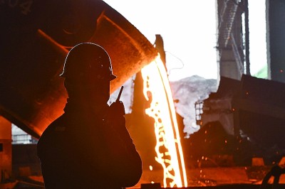 柳钢集团钢铁废渣综合利用生产车间,青年机械工程师在指挥工人倾倒钢水。新华社发