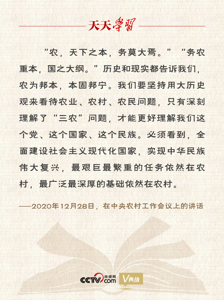 尽管我们的“三农”工作取得了显著成就,但必须清醒地看到,当前国际环境日趋复杂,不稳定性不确定性日益增加,新冠肺炎疫情影响广泛深远,经济全球化遭遇逆流,世界进入动荡变革期。从世界百年未有之大变局看,稳住农业基本盘、守好“三农”基础是应变局、开新局的“压舱石”。对我们这样一个拥有14亿人口的大国来说,“三农”向好,全局主动。全党务必充分认识新发展阶段做好“三农”工作的重要性和紧迫性,围绕立足新发展阶段、贯彻新发展理念、构建新发展格局带来的新形势、提出的新要求,坚持农业农村优先发展,走中国特色社会主义乡村振兴道路。