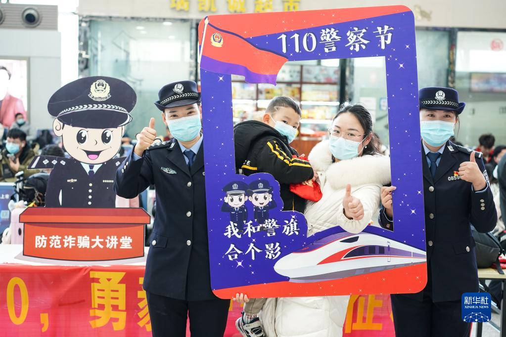 南京铁路公安处联合南京市公安局公交治安分局在南京火车站举行迎接“中国人民警察节”活动,民警和旅客在活动上合影(2022年1月7日摄)。新华社记者季春鹏摄