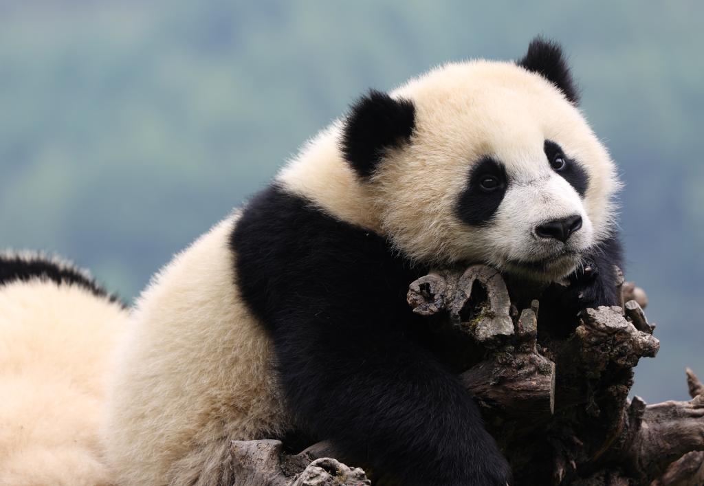 今年4月24日,在中国大熊猫保护研究中心卧龙神树坪基地内,一只大熊猫在树上休息。新华社发