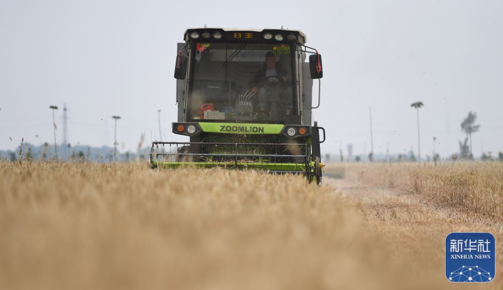 5月22日,在河南省南阳市唐河县湖阳镇周安村,收割机在麦田作业。新华社记者 张浩然 摄