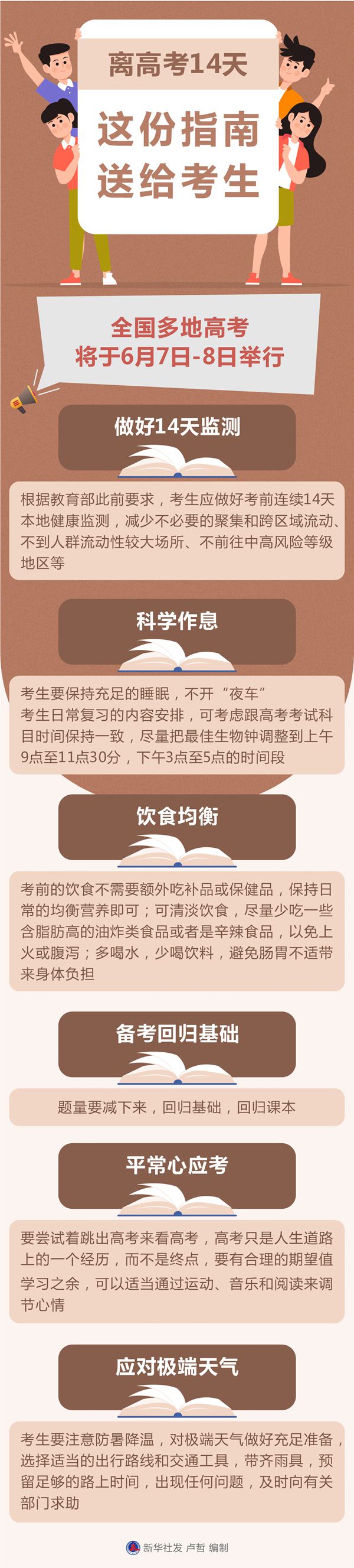 【做好14天监测】全国多地高考将于6月7日-8日举行。根据教育部此前要求,考生应做好考前连续14天本地健康监测,减少不必要的聚集和跨区域流动、不到人群流动性较大场所、不前往中高风险等级地区等。