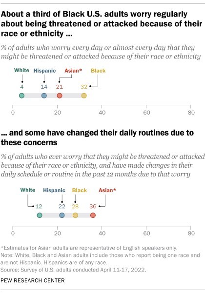 皮尤研究中心2022年4月中旬进行的调查数据显示,受访者中约有三分之一的黑人担忧因种族原因受到暴力袭击,而白人受访者中这一比例仅占4%。图片来源:皮尤研究中心官网