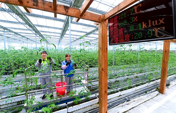 贵澳农旅产业示范园大数据与农业经济深度融合。图为工人在生态高效蔬果采摘体验馆为水果西红柿授粉。陈慧 摄