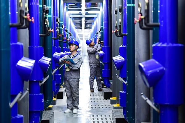 中国联通贵安云数据中心技术人员在机房室内巡检微模块进出水管阀门压力表。图为中国联通在南方建设的最大云数据中心。陈慧 摄