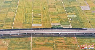 2022年5月27日,位于河南省焦作市武陟县的黄河滩小麦产区风景如画、丰收在望。目前正值当地冬小麦浇灌关键期,黄绿相间的麦田与川流不息的列车构成了一幅生动活力的美好乡村画卷。(王玮摄/光明图片)