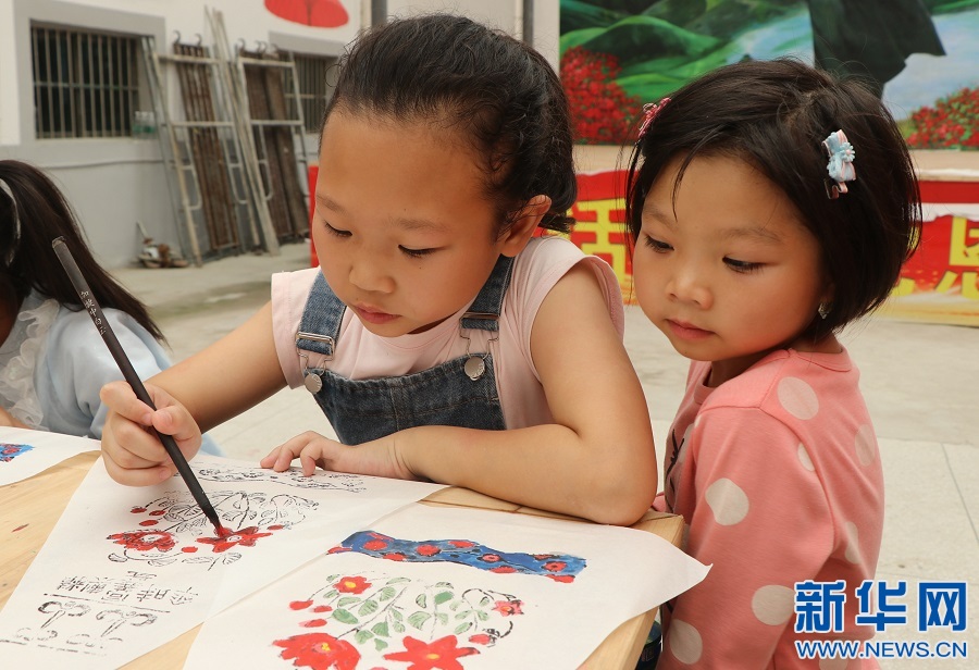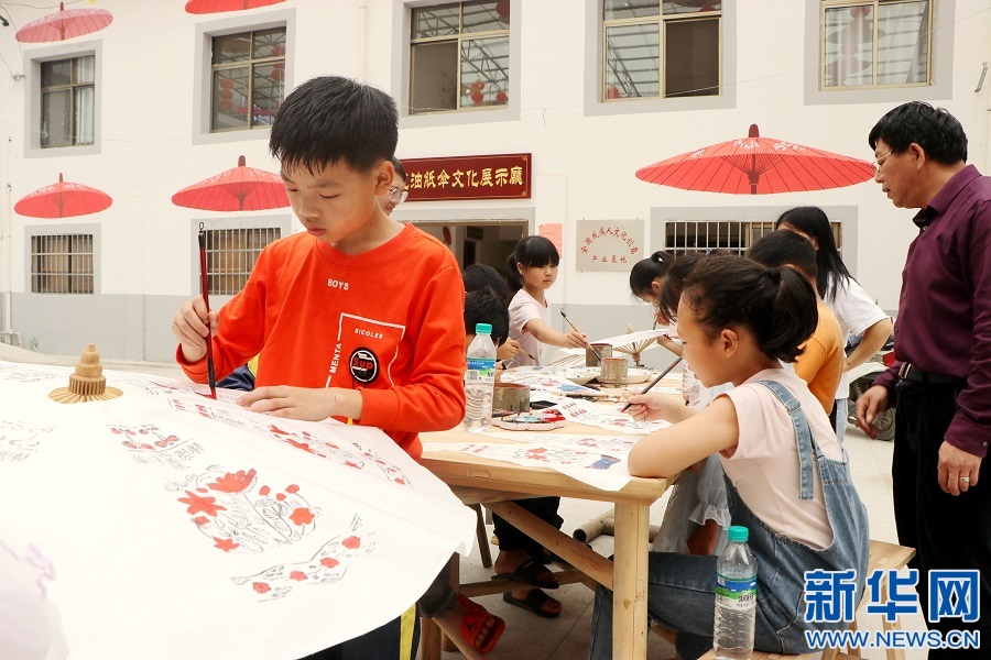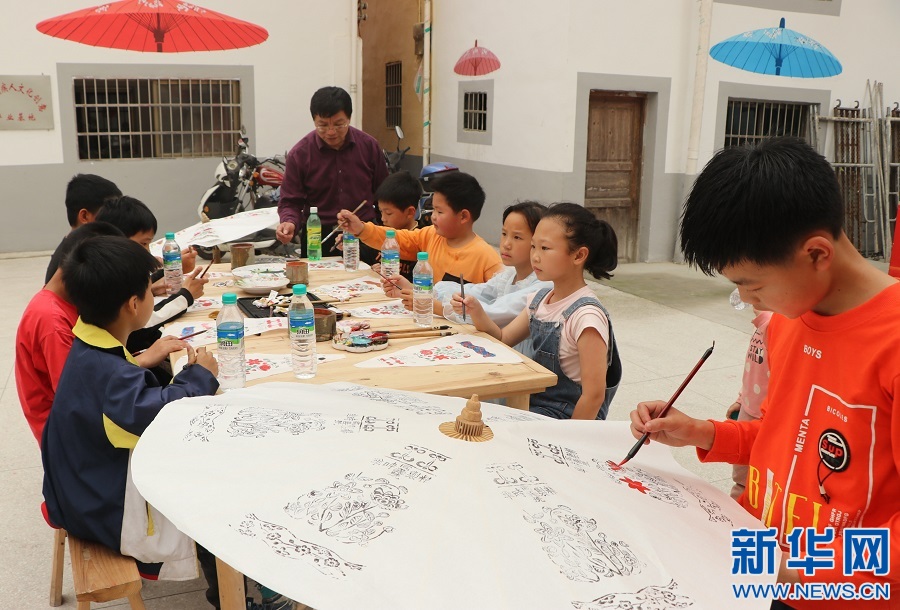 ▲在江西省遂川县黄坑乡龙口村,孩童们跟着当地油纸伞制作传承人胡海华,学绘纸伞面图画。新华网发 李建平 摄