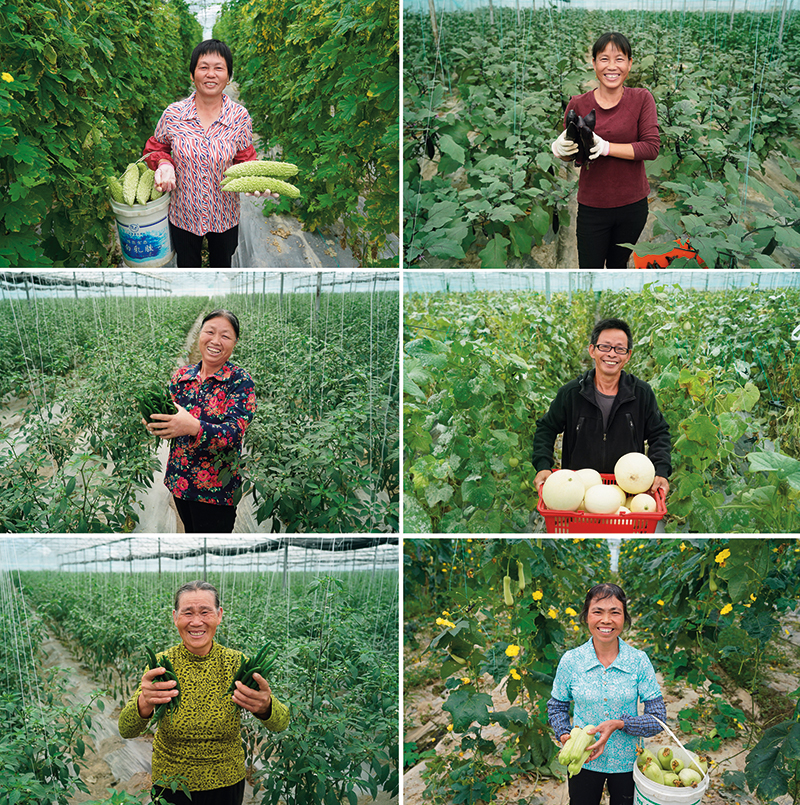 江西省赣州市于都县梓山镇潭头村的果蔬种植基地,村民们展示收获的蔬菜(2020年10月21日摄) 万象摄/本刊