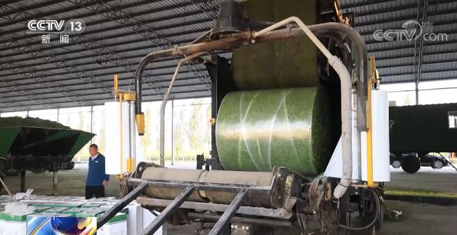 紫花苜蓿收割后需要在地里晾晒一段时间,水分含量达到一定标准后再由捡拾机粉碎、装车运回仓库;随后进行裹包加工,将苜蓿压实成型,制成每个750公斤的饲料包。