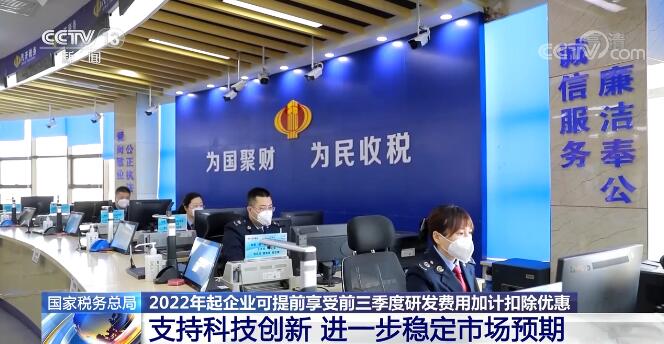 央视网消息:国家税务总局6月9日发布消息,《关于企业预缴申报享受研发费用加计扣除优惠政策有关事项的公告》已印发,明确从2022年起,企业可以在每年10月申报期申报享受前三季度研发费用加计扣除政策优惠,把2021年10月提前享受当年的研发费用加计扣除政策举措转化为制度性规定,进一步稳定市场预期,支持科技创新。